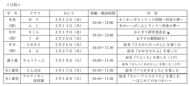 プログラム Twitter Facebook はてブ Pocket LINE コピー 2025.02.082023.02.06 プログラム 年始の華やかな空気も落ち着き、冬の寒さが本格化してまいりました。保護者の皆様におかれましては、いかがお過ごしでしょうか。 さて、成長計画案でお知らせしておりました通り、下記の日程で活動参観を行います。『言葉』を通してそれぞれの思いや考えを表現するこどもたちの成長を参観を通して感じていただける時間になればと思います。